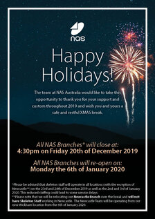 All NAS Branches (Cairns, Warana, Brisbane & Newcastle) will close at 4:30pm on Friday the 20th of December 2019 and will re-open on Monday the 6th of January 2020.